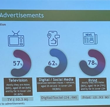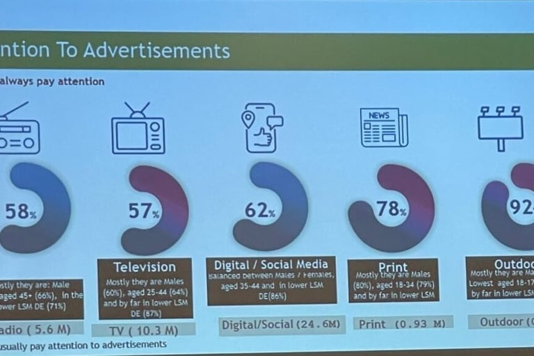 O digital e as redes sociais registam 62% de atenção, com um perfil de audiência equilibrado em termos de género, concentrado nos 35-44 anos e fortemente representado nos segmentos socioeconómicos mais baixos (LSM DE: 86%). A rádio e a televisão apresentam as taxas de atenção publicitária mais baixas: 58% e 57% respectivamente o que não invalida a sua escala de alcance, mas sugere um ambiente de consumo mais passivo e multi-tarefa.